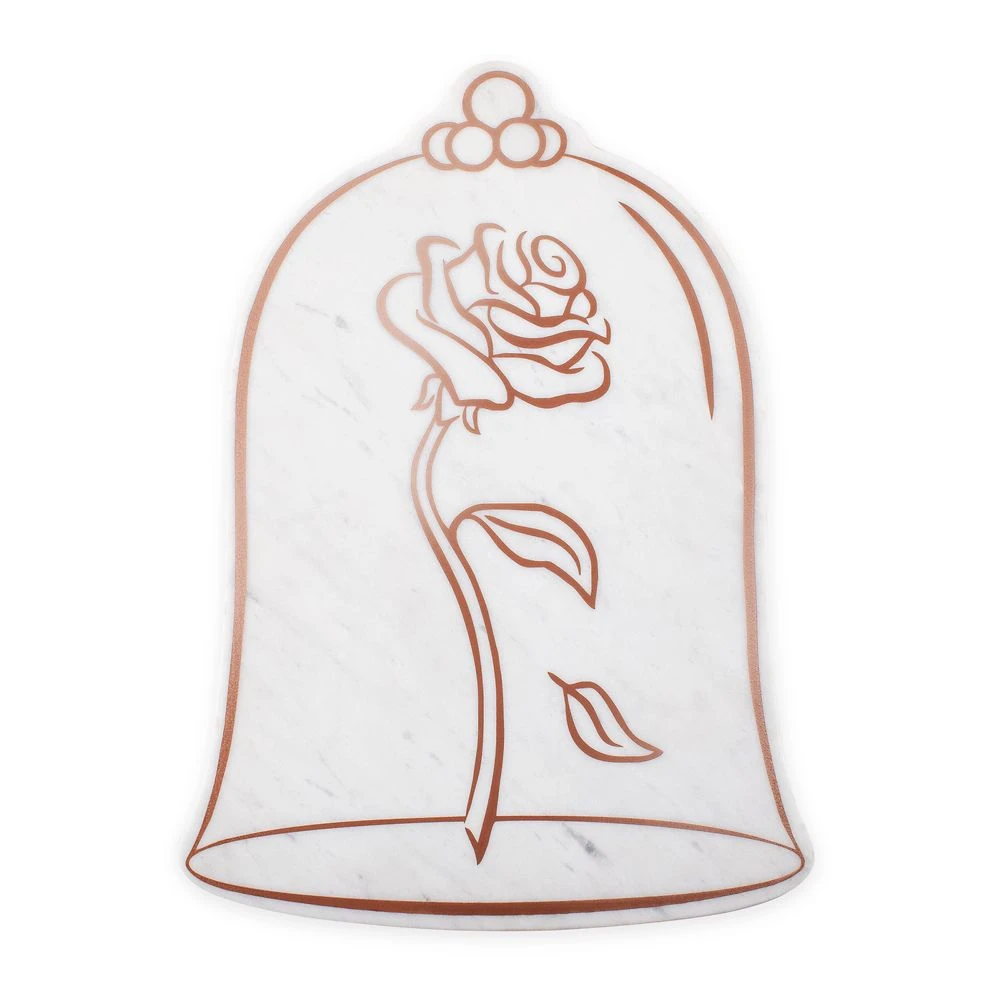 Be our guest and add a touch of fairytale romance to mealtimes with this Beauty and the Beast Serving Stone. Fashioned from white marble and acacia with elegant rose gold inlay, it takes its shape from the memorable bell jar with Enchanted Rose featured in the beloved movie.