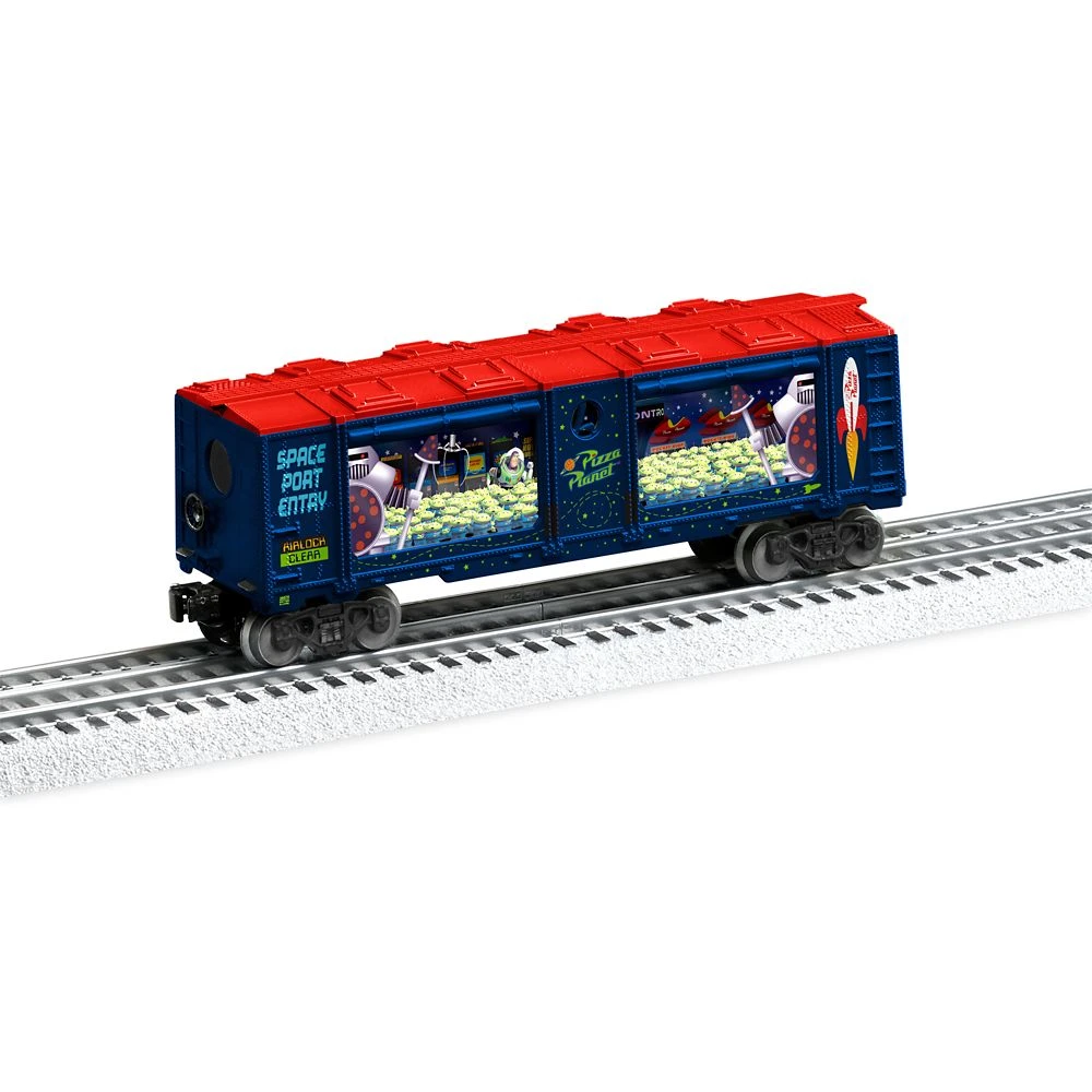It’s the claw! Our hero faces a notorious nemesis amid a host of wide-eyed Space Aliens in this Buzz Lightyear ”Pizza Planet” aquarium car by Lionel. Cheer Buzz on as he is chased by the claw inside the illuminated car when it is powered on. Inspired by Disney and Pixar’s Toy Story, the single car also features the Pizza Planet logo as well as signage for the Space Port Entry. Be aware that the airlock must be in the ”clear” position. That might be make believe but you will have real fun with this great addition to your Toy Story train set by Lionel.