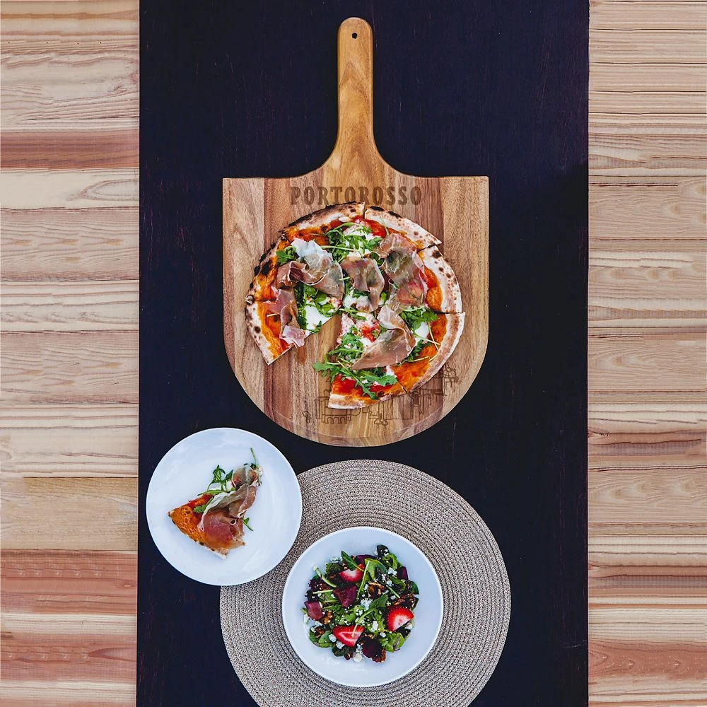 This Luca-inspired acacia wood serving paddle with a beveled edge makes your oven-to-table pizza transfer a slice of heaven. The tapered handle allows for a steady and comfortable grip, while the beautiful natural wood grain and evocative etching of Portorosso ensures it will look bellissima on the table or hanging on the wall.
