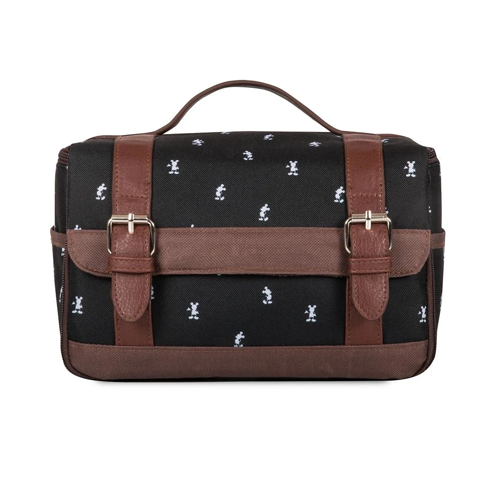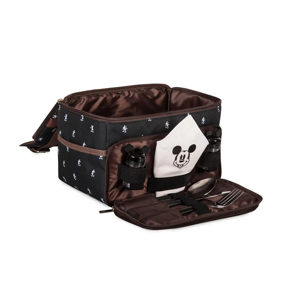This Mickey Mouse lunch tote has all the ingredients to make meal times magical. The tasteful design features an allover Mickey silhouette print, faux leather trim, and a front pocket that unzips to reveal a deluxe service for one.
