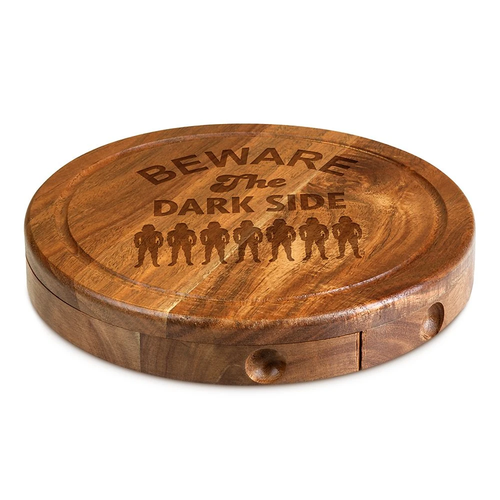 ”Beware the dark side” is good advice where cheese is concerned, but you won’t be able to resist the squadron of Stormtroopers who’ve gathered for a gouda time on the cover of this cheese board. Etched into the round acacia wood, which opens to reveal three cheese tools, they will serve you and the Empire in good taste.