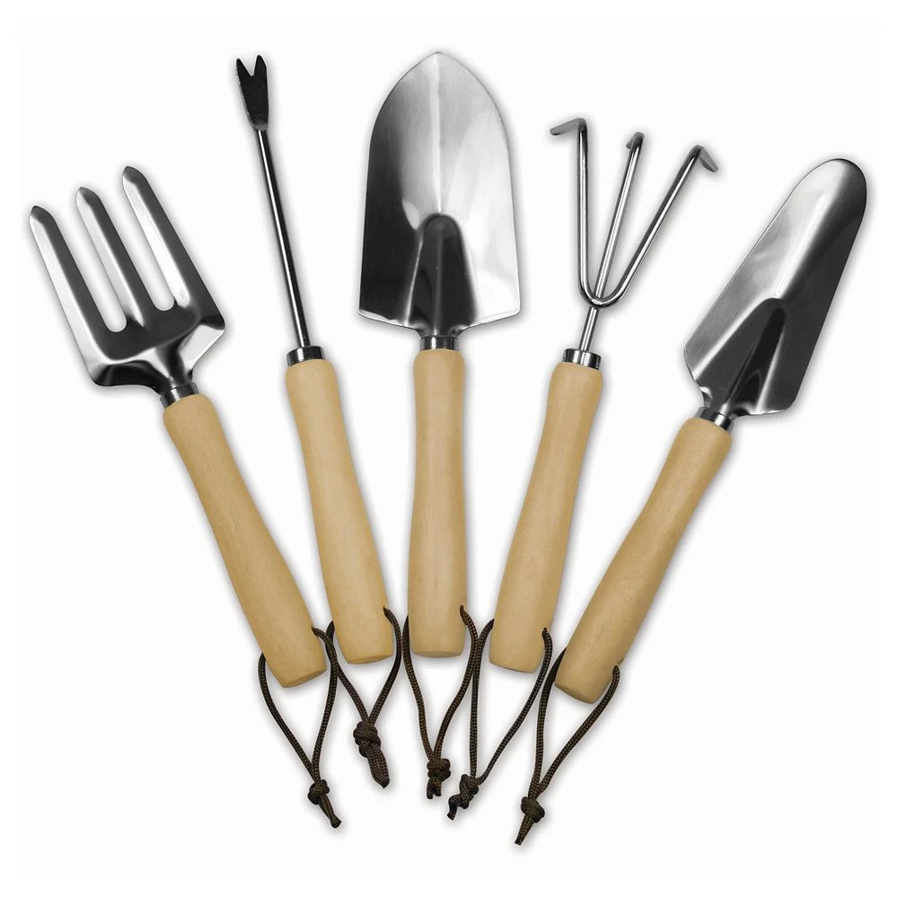 - Includes five steel gardening tools: garden fork, weeder, broad face trowel, cultivator/hand rake, and narrow face trowel