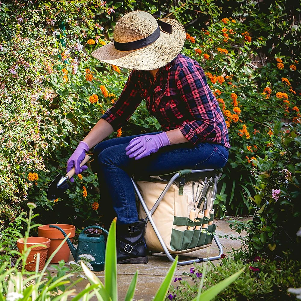 For the kings and queens of the garden, this is their throne. Enjoy cultivating your own personal Hundred Acre Wood with the Winnie the Pooh Gardener Folding Seat with Tools. Now you can garden in comfort with this lightweight and portable sturdy steel frame chair that supports up to 200 lbs. It sports a detachable, polyester underseat storage tote with external tool pockets for easy access while sitting.
